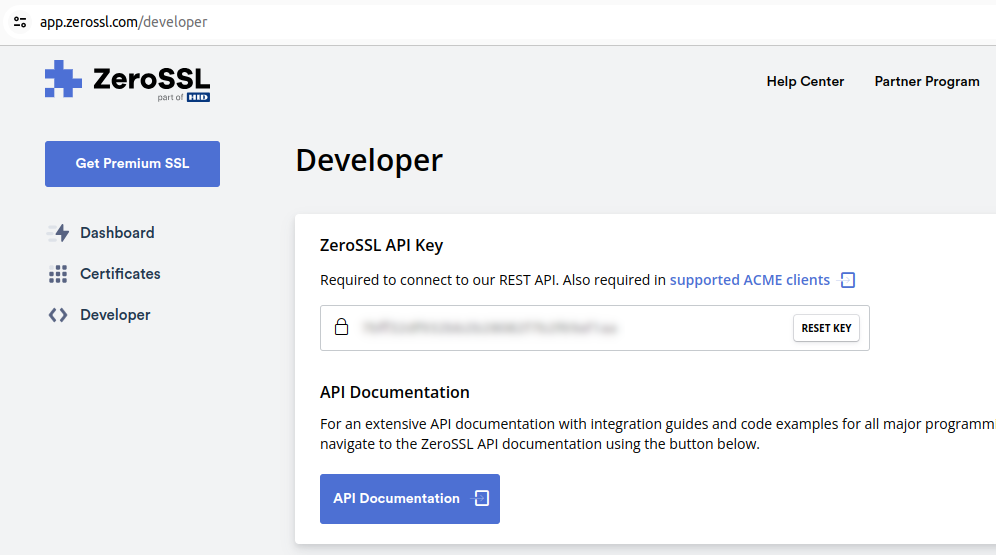 Developeron the left sidebar.Copy your ZeroSSL API key to provide to dashmate later. Do not create a “New certificate”.