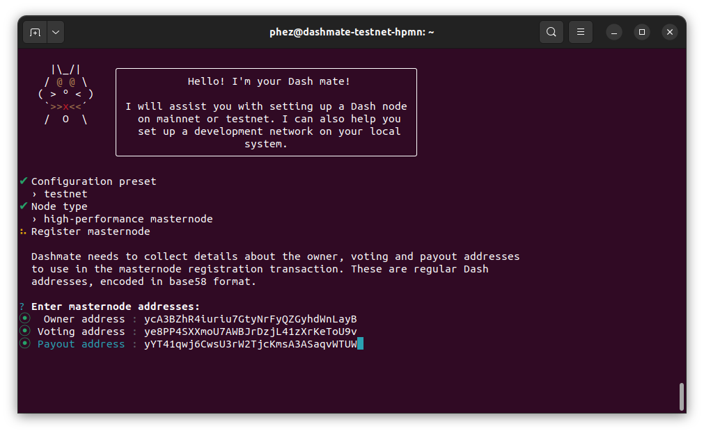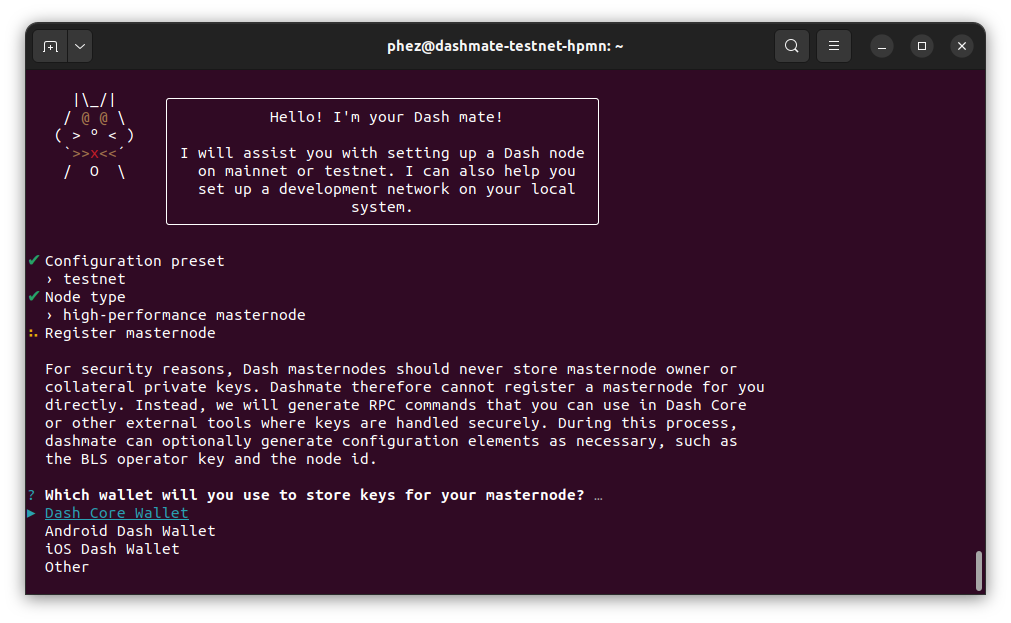 To begin masternode setup, run dashmate setup to start the interactive wizard: