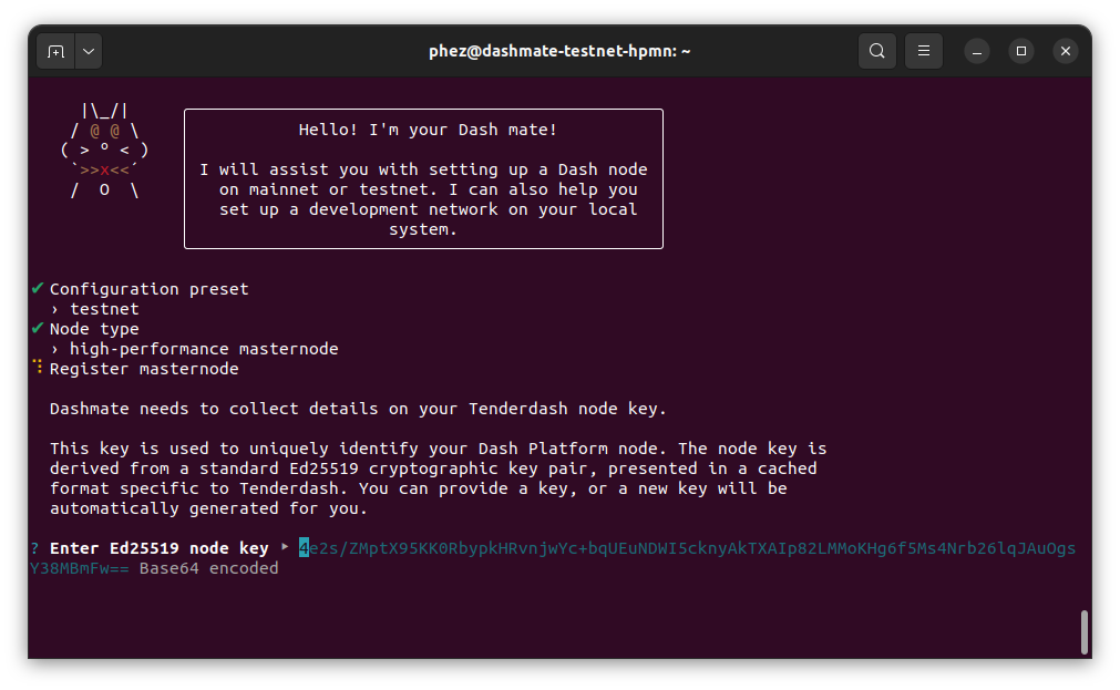 Enter a Platform node key. You can enter one you have created or received from a hosting provider. Optionally, use the one automatically generated by dashmate.