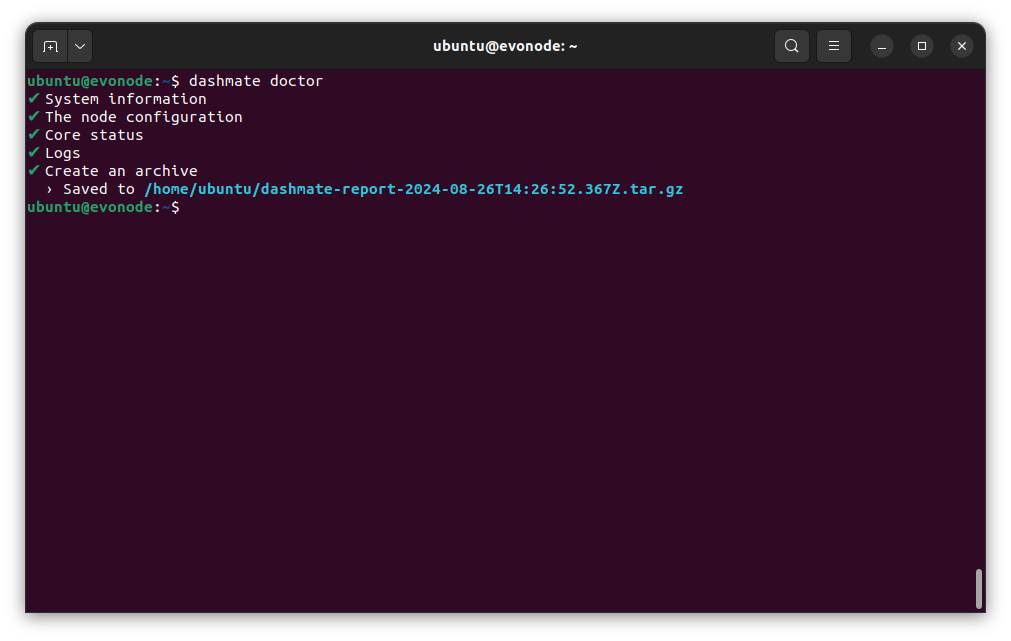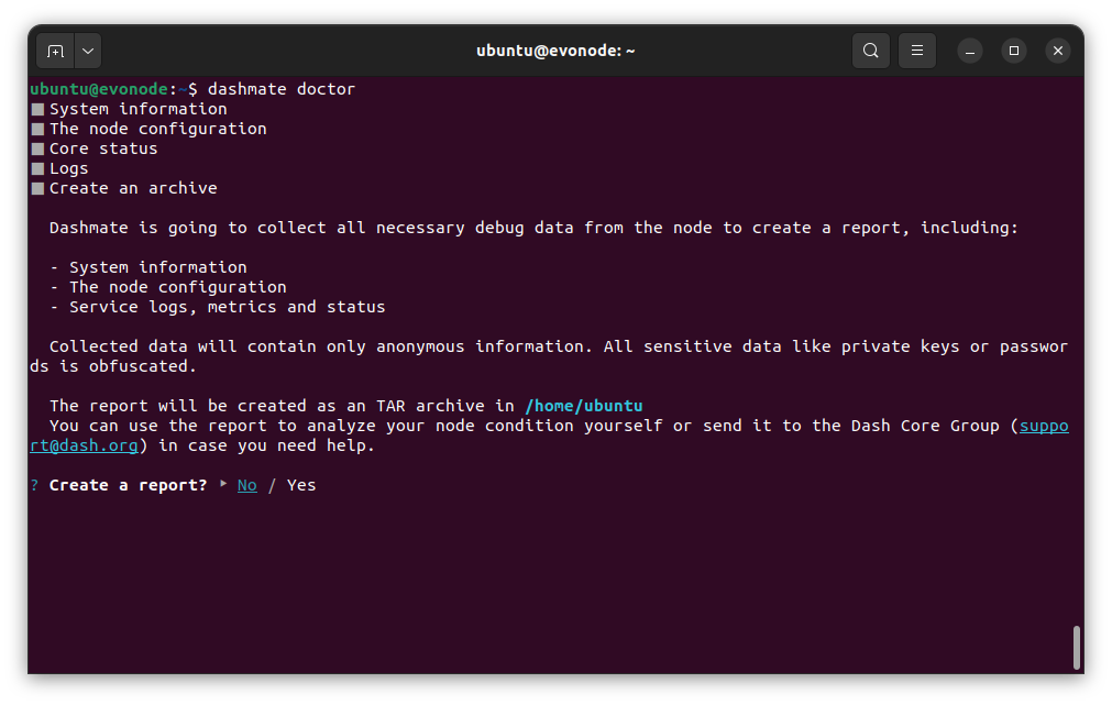 Dashmate includes the doctor command to make troubleshooting and log reporting easier. The dashmate doctor command collects important debugging data about the masternode and creates a compressed report file that can be sent to the support team if necessary. This report includes: