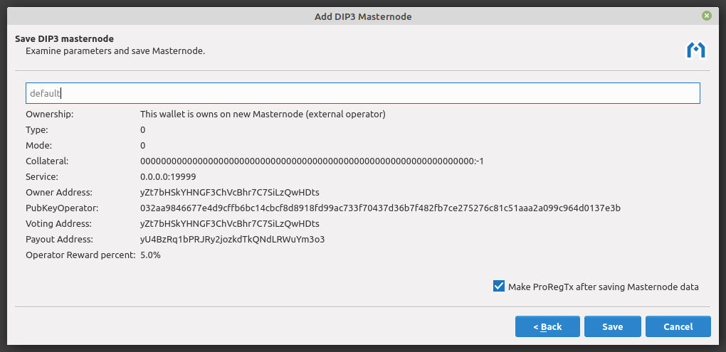 All parameters are now configured. This screen shows the configuration details and allows you to save the information. Make sure the Make ProRegTx after saving Masternode data box is checked, then click Save. The Send tab will open and be populated with the info necessary to register the masternode.