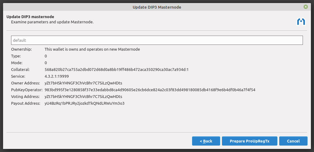 All parameters are now configured. This screen shows the updated configuration details. Click Prepare ProUpRegTx to continue. The Send tab will open and be populated with the info necessary to update the masternode.