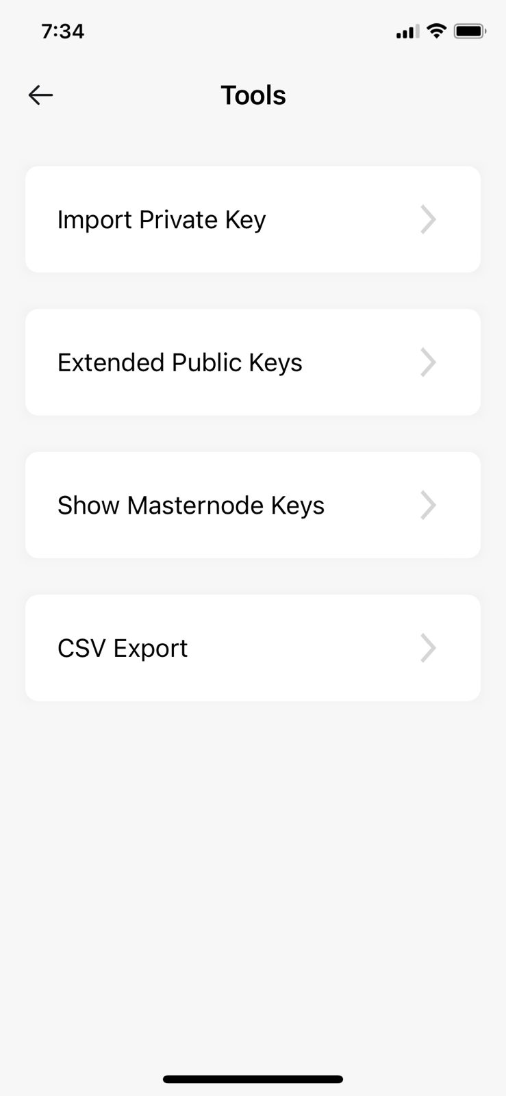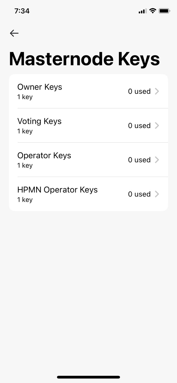 Certain masternode keys may be generated and stored in Dash Wallet. To access these keys, tap the Menu button and select Tools. Tap Masternode Keys and enter your PIN to open the Masternode Keys screen. From here, tap on any of the listed key types to view existing keys or generate new ones. The screen will show all used keys and the first unused one. To generate additional keys, tap the + button.