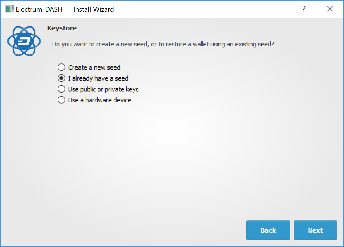 Recovery takes place in two steps. First, we will convert the Dash iOS recovery phrase into an xprv key. In the second step, we will import the xprv key into Dash Electrum.