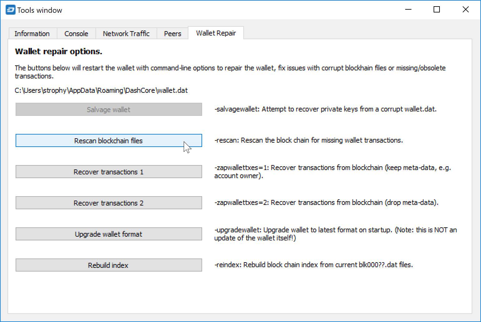 Now open Dash Core and wait for blockchain synchronization to complete. Your wallet will be restored/upgraded and all balances should be displayed. You should ensure you have the correct password by trying to unlock your wallet from Settings > Unlock Wallet to make sure you can actually create transactions using your balances. If you have any problems with your balance not appearing, try to force a rescan of the blockchain by going to Window > Wallet Repair and selecting Rescan blockchain files. Rebuild index may also help. Dash Core will restart and perform a full scan of the blockchain.